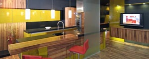 Sestavu ještě oživuje velká vestavěná skříň, jejíž dvířka jsou z barveného metakrylátu v hliníkovém rámečku. Takto barevně vyladěná sestava do prostoru pěkně zapadá a vynikne i díky šedě a černě vymalovaným stěnám. Vše ještě doplňují spotřebiče v nerezovém provedení. |