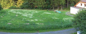 Pobytová část zahradyZadní část bude sloužit hrám dětí a odpočinku dospělých. Obě funkce může plnit současně díky správnému členění prostoru. Dětský koutek jsem navrhla hned v těsné blízkosti domu, aby na něj bylo dobře vidět z okna kuchyně. Hned vedle něj bude několik ovocných keřů (rybíz, angrešt, maliny, kanadské borůvky), aby děti mohly zdravě „mlsat“. Pergola obrostlá voňavými popínavkami (zimolez – Lonicera) schovává v protilehlém rohu zahrady udírnu. S terasou je posezení spojeno štěrkovou cestičkou, lemovanou z jedné strany trvalkami a z druhé travinami. Dominantou této partie je jasan zimnář (Fraxinus ornus). Pergolu mohou obrůstat popínavé rostliny, např. zimolez – Lonicera periclymenum ´Serotina´. Vstupní a pobytovou část oddělí dva jehličnany – borovice sivá (Pinus parvifora ´Glauca´) a žlutopestrý tis (Taxus baccata ´Dovastonii Aurea´), které budou pěkným pozadím pro záhon s nižšími keři. Okolí zahradního posezení zdobí malý trvalkový záhon, který volně přejde v nižší keřovou výsadbu, jíž budou podle přání majitelů dominovat dva ovocné stromy. Ty budou podsázeny nenáročnými pokryvnými dřevinami, ale jen řídce, aby nebránily trhání zralého ovoce.